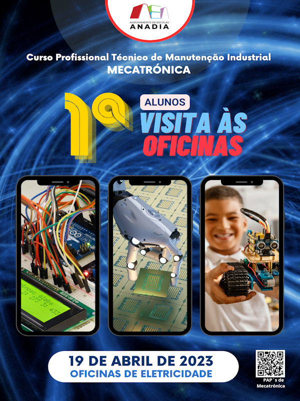 Com a ajuda do alunos do 12ºJ do Curso Profissional de Técnico de Manutenção Industrial, foi elaborado o cartaz de divulgação da atividade "1ª Visita às Oficinas" que se prevê decorrer no início do 3º período, a 19 de Abril. Durante este dia serão dadas a conhecer algumas das temáticas abordadas pelo curso, recorrendo a trabalhos realizados pelos alunos que serviram para demonstrar as competências e os saberes desenvolvidos ao longo da formação.
